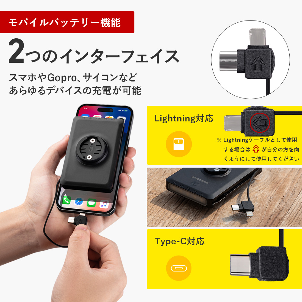 ・3つインターフェイス(Type-C/MicroUSB/Lightning)を備えておりお手持ちの携帯・サイクルコンピューター