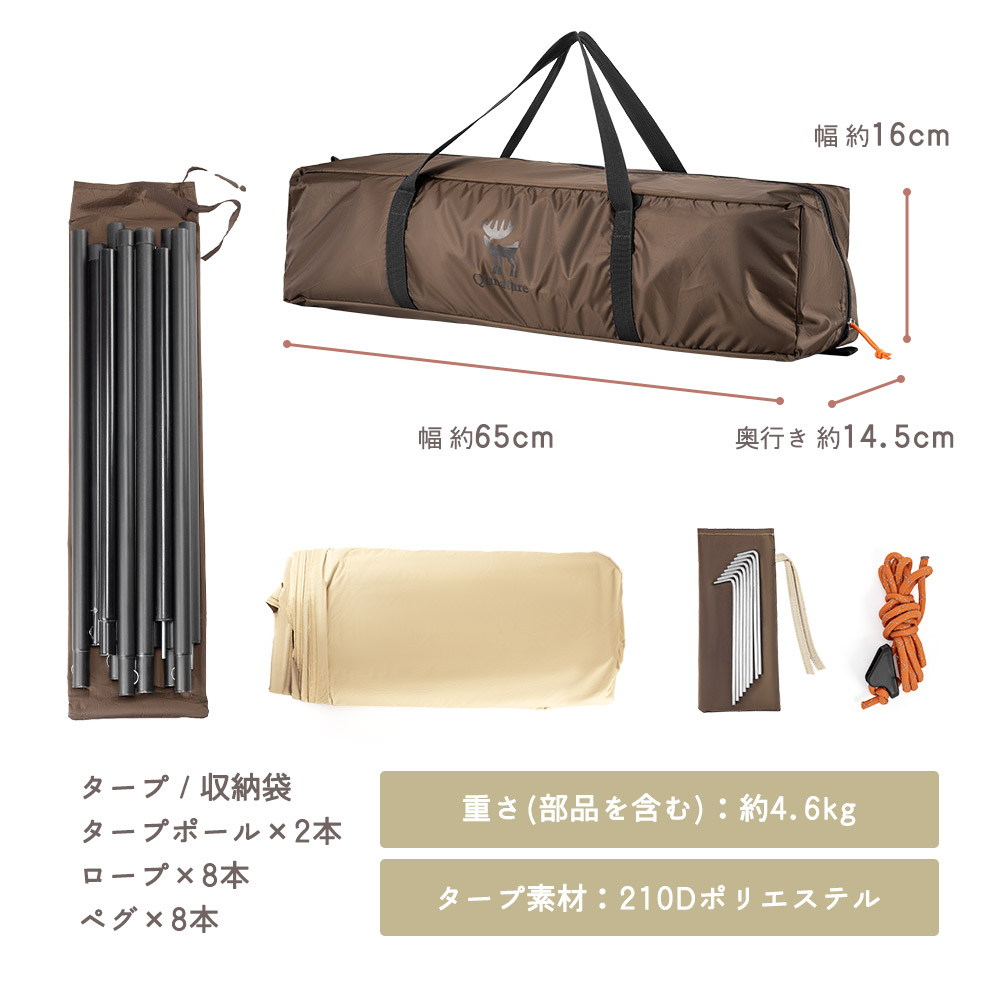 | サイズ | ■サイズ: ・広げた時の幅 → 横幅 約430cm(4.3m) × 縦 約420cm(4.2m) ・タープポール → 高さ 約240cm(2.4m) ■ 重さ:約4.6kg(タープポール、ロープ、ペグなどの部品を含む) ■ 収容人数 :4人から最大12人まで対応のファミリーサイズ ■遮光面積:18平方メートル |