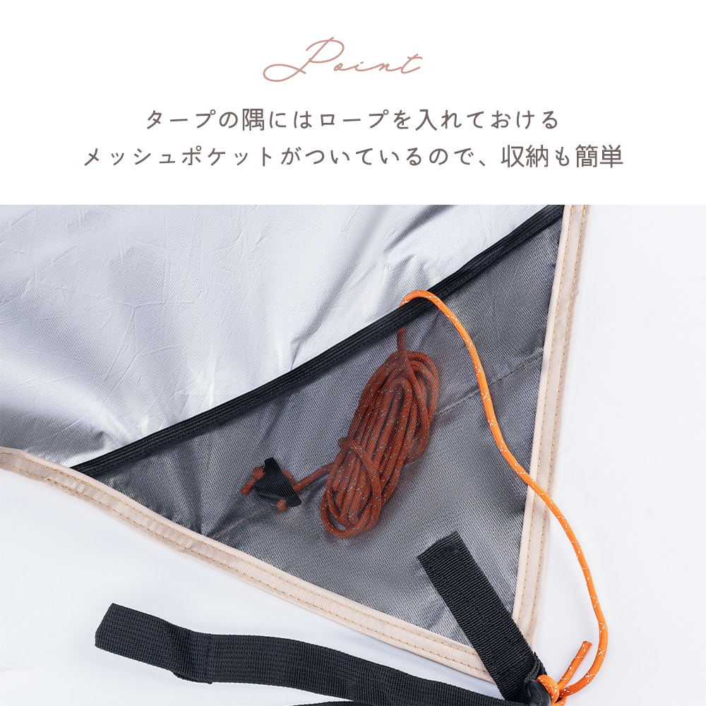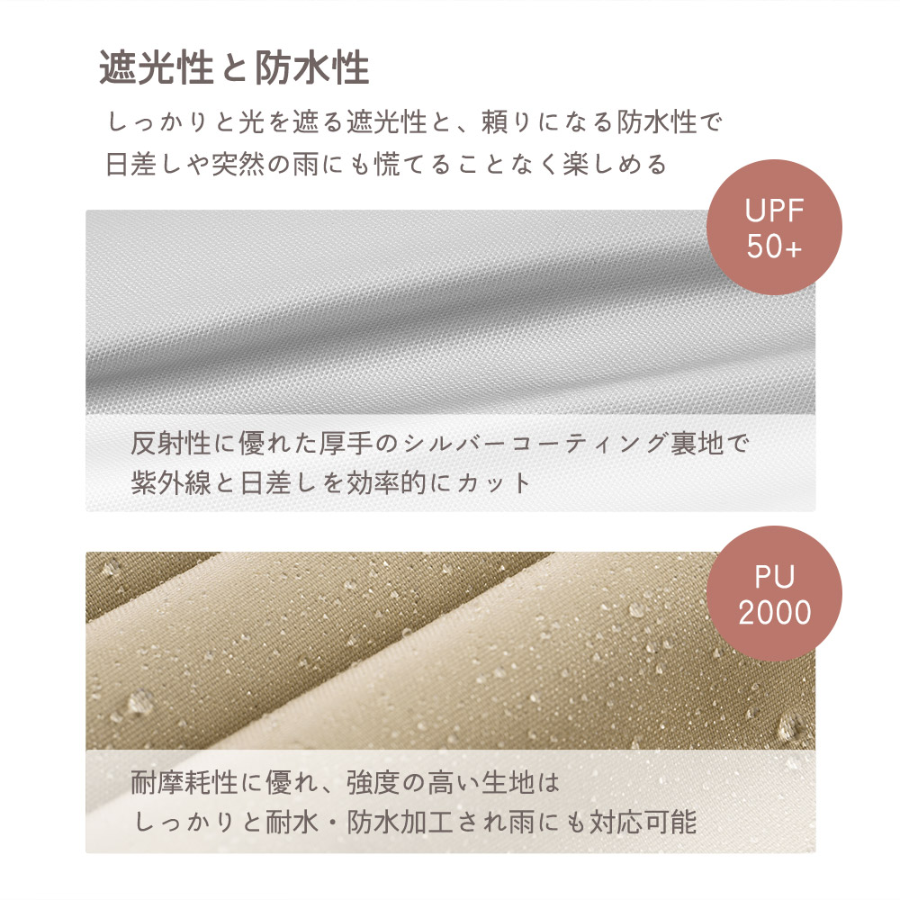 | 注意事項 | ・シートの防撥水加工に使用しているコーティングは、高湿度な環境下だと劣化が進みやすくなります。雨や霧などでシートが濡れた際には、使用後はしっかりと乾燥させてから保管してください。 ・ 防撥水生地ではありますが、長時間の雨や大雨の際のご使用はお控えください。 ・シートの撥水コーティングの劣化を防ぐため、刺激性の強い洗濯洗剤または用品の使用はお控えください。 ※できるだけ実物の色に近くなるように努めておりますが、お使いの環境(モニター・ブラウザ・照明等)により、色の見え方が異なる場合がございます。 |