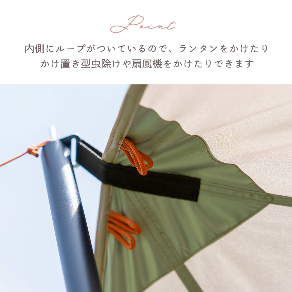 ランタンや扇風機、虫除けを吊るせるループ付き。