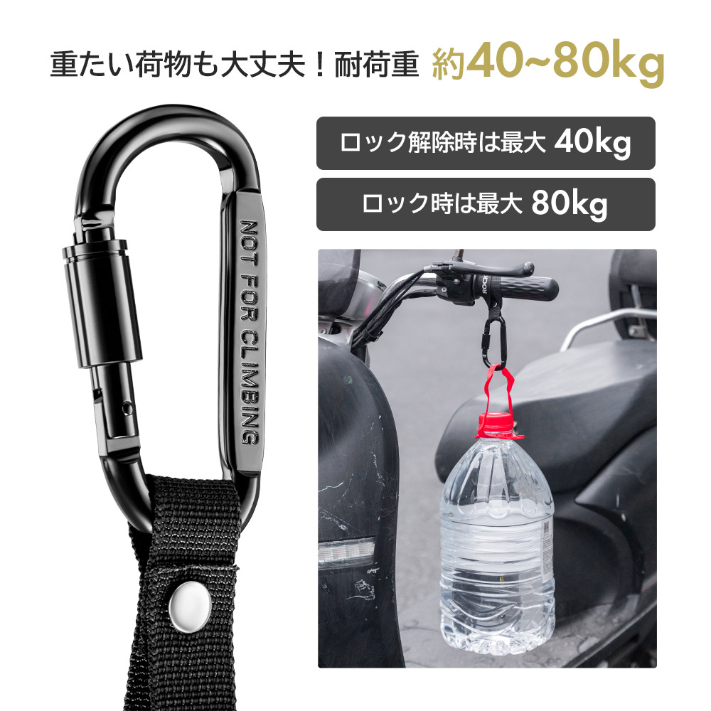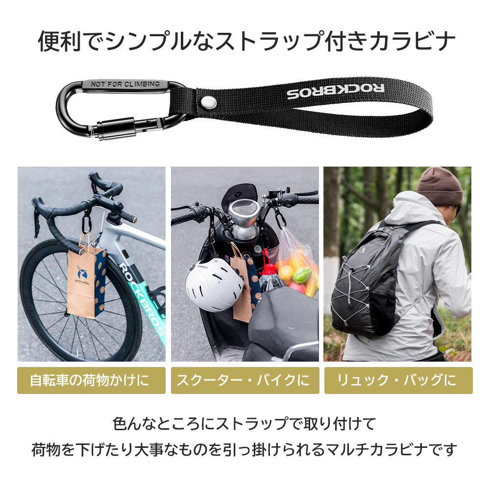 自転車・バイク・アウトドアシーンで大活躍する、ストラップ付きの多用途カラビナ。荷物の持ち運びや吊り下げに最適です。
