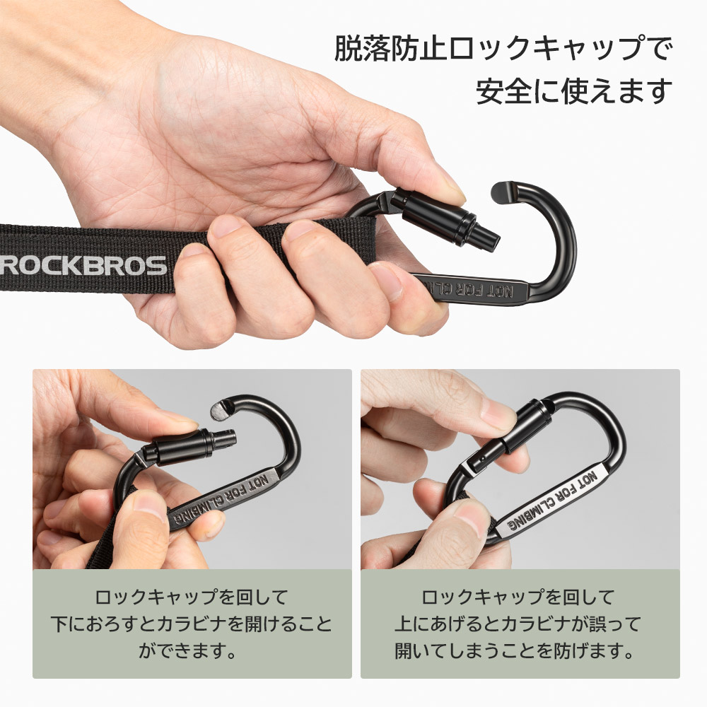 ブラックのアルミ製カラビナと「ROCKBROS」ロゴ入りストラップで、スマートなデザイン。