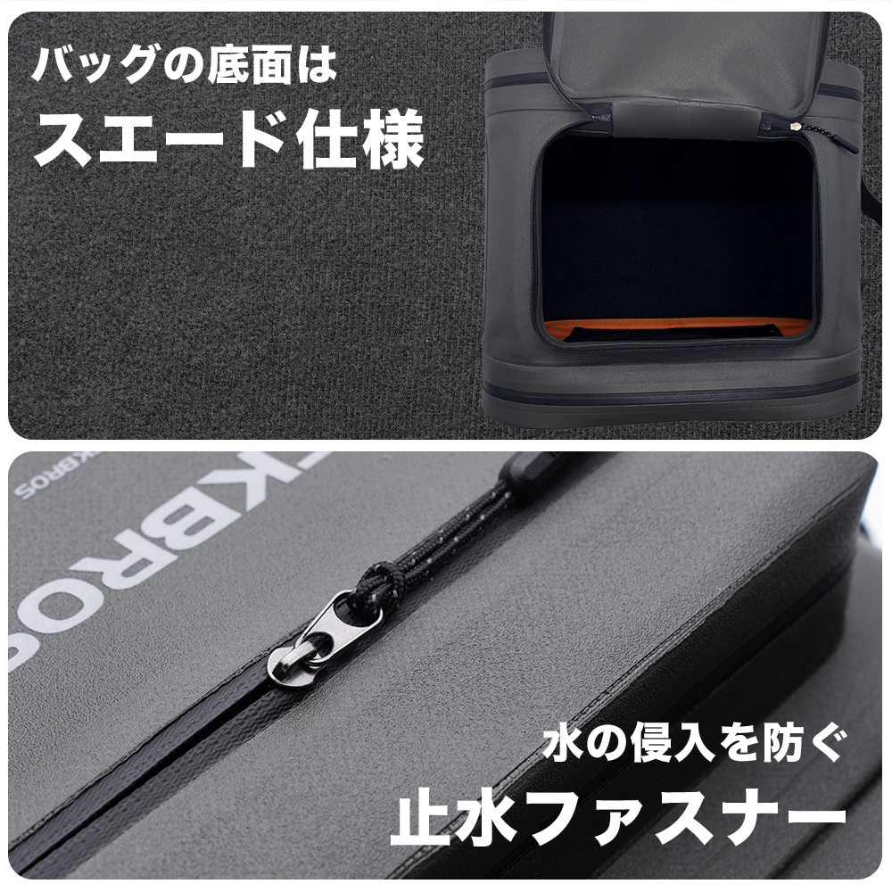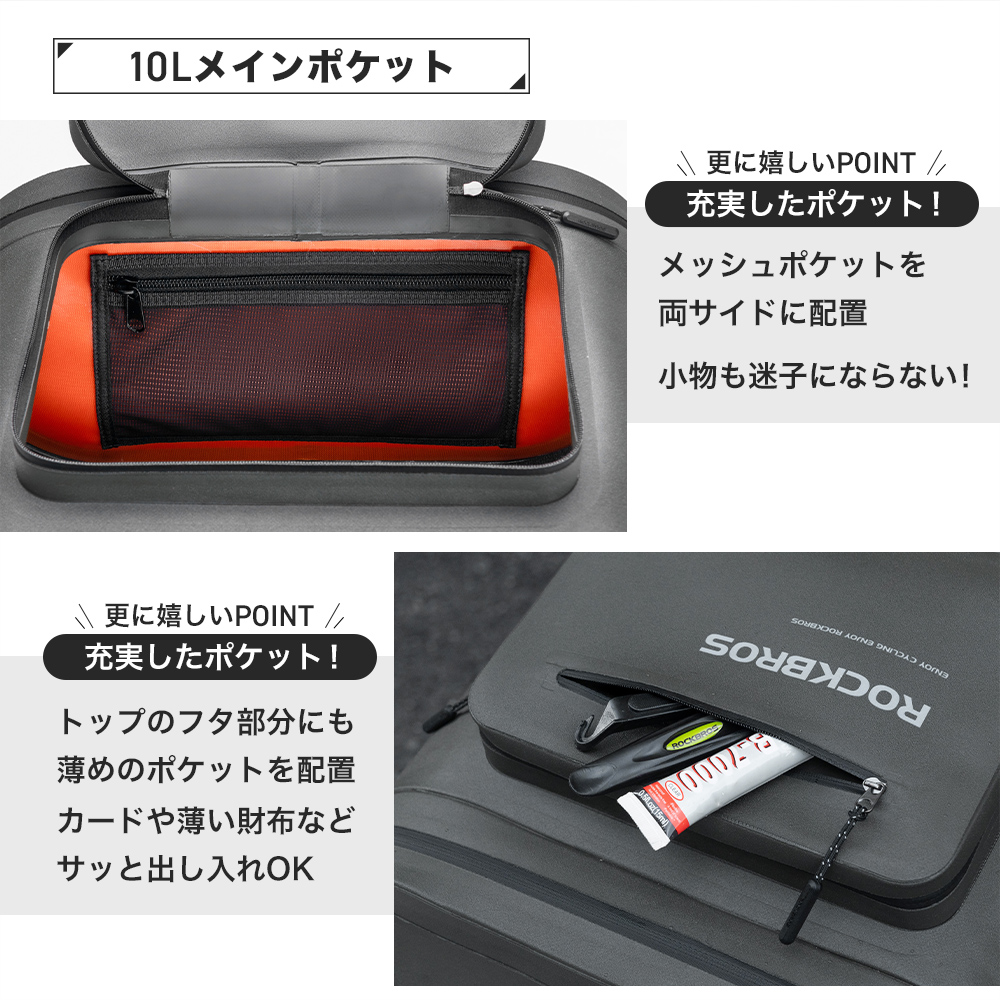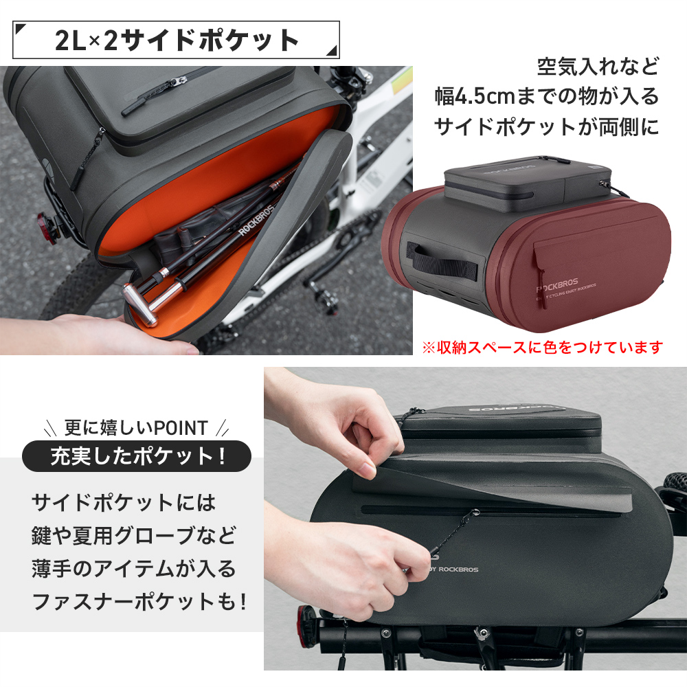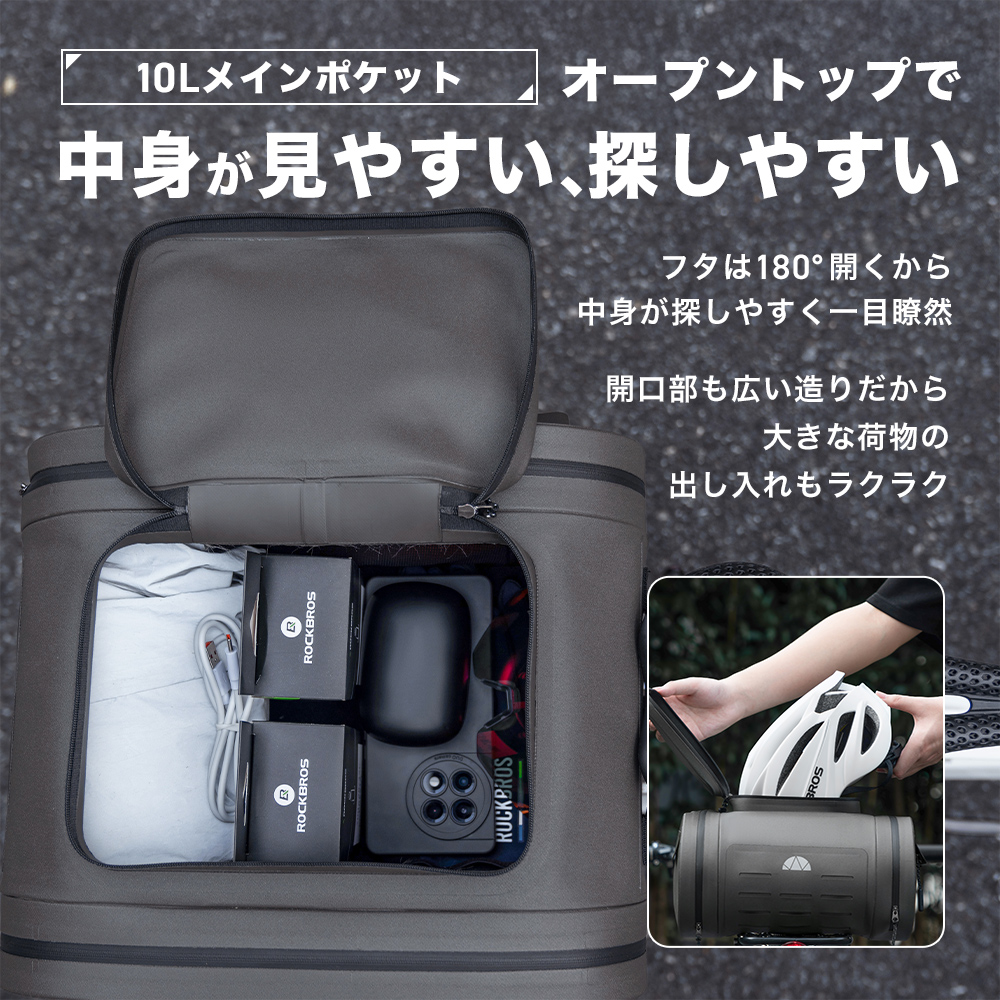 ・メインポケット10L+左右各2Lでのサイドポケットで分けて収納可能