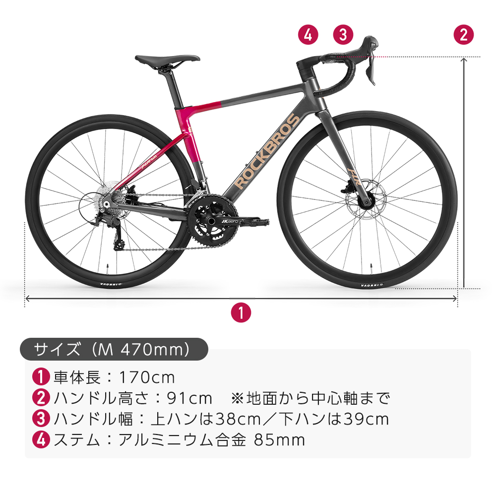 | サイズ | サイズ(M 470mm) ●1 車体長:170cm ●2 ハンドル高さ:91cm ※地面から中心軸まで ●3 ハンドル幅:上ハンは38cm/下ハンは39cm ●4 ステム長:8.5cm 推奨適応身長 ・S 450mm:約155?170cm ・M 470mm:約160?175cm ・L 490mm:約170?185cm 推奨適応体重(全てのフレームサイズで共通) ・100kg以下 |