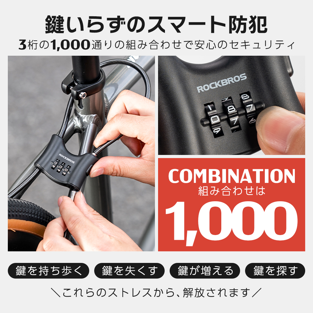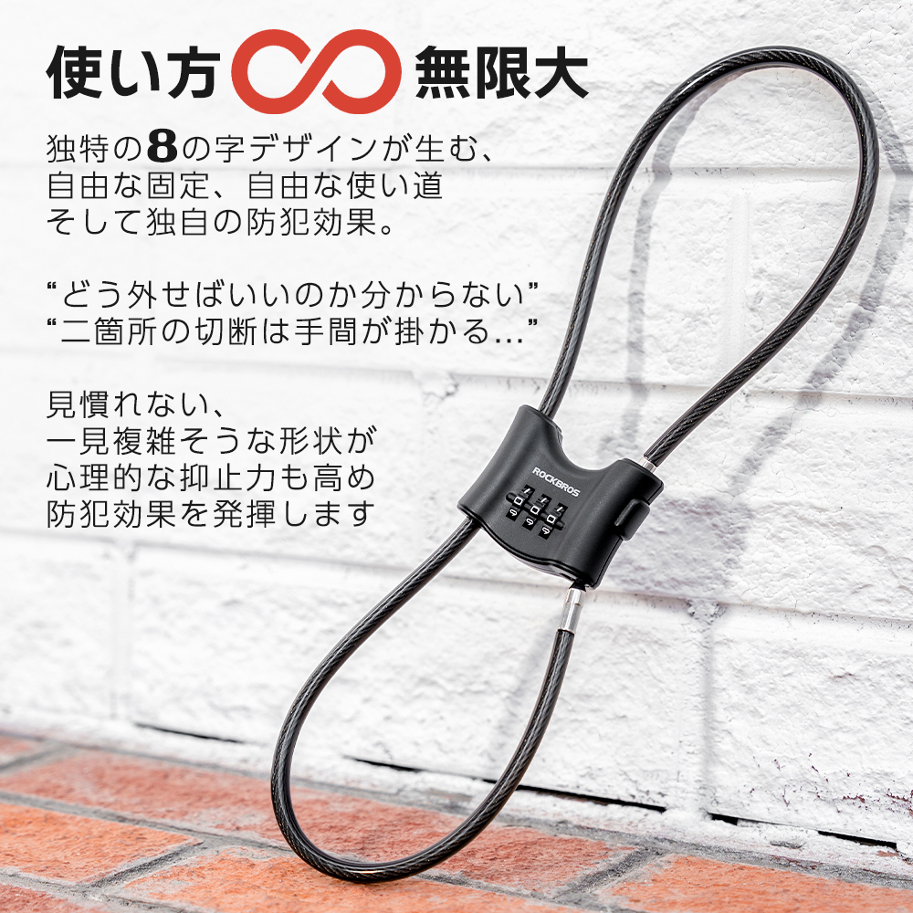 8の字構造が生み出す自由自在な固定と、5.5mm径の太ケーブルがもたらす高い防犯性。自転車からバイク、アウトドアギア、置き配 宅配ボックスまで、あらゆるシーンで活躍する多目的ロック!