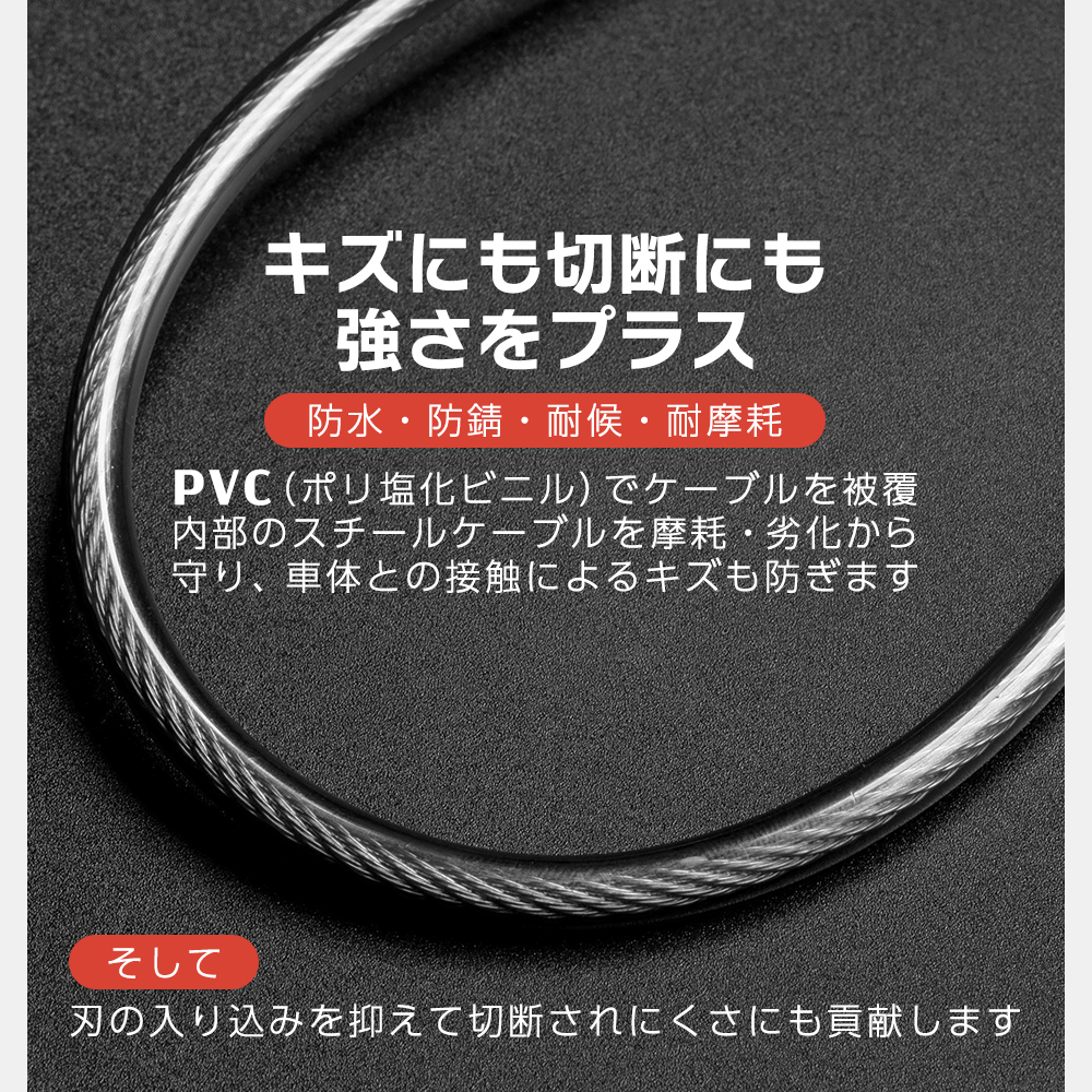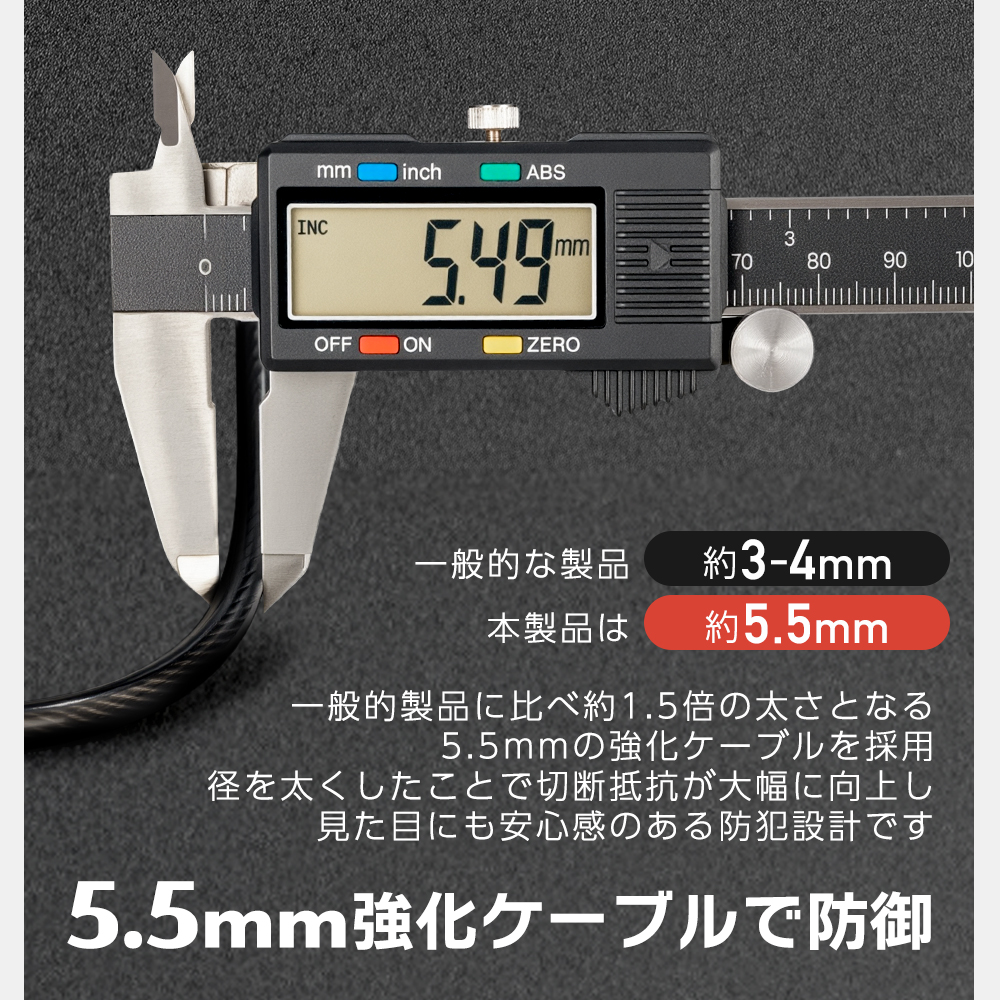 一般的なケーブルロック(約3?4mm)より、およそ1.5倍の太さを誇る5.5mm強化スチールケーブルを採用。PVC被覆が摩耗・サビ・紫外線から守り、屋外でも安心のタフ設計です。愛車の擦り傷も予防します