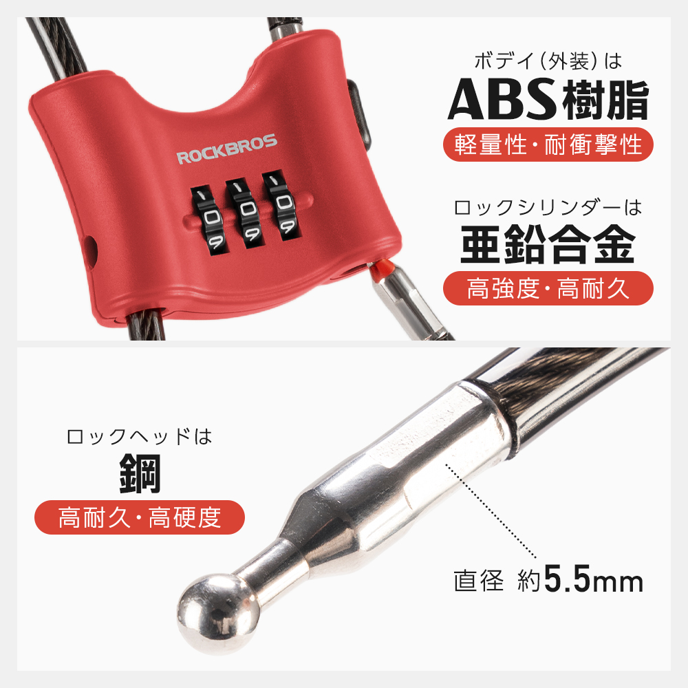 | 素材 | ■材質 ・ボディ(外装):ABS樹脂 ・ロックシリンダー:亜鉛合金 ・ケーブル:PVC+スチールワイヤー |