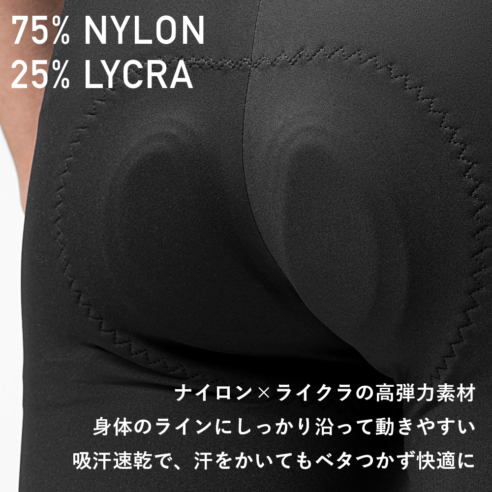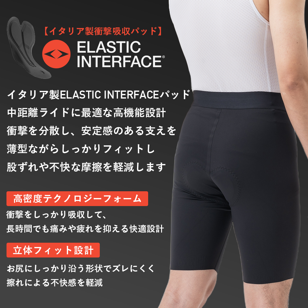 イタリア製「ELASTIC INTERFACE製」のパッドを使用した高性能サイクリングパンツ