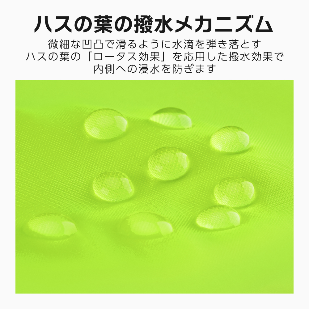 ハスの葉の「ロータス効果」を応用した撥水性能で、雨粒を滑るように弾き落とします。表面の微細な凹凸が水滴の浸み込みを防ぎ、ヘルメット内部をドライにキープ。通勤・通学・ツーリング時の頼れる防水対策におすすめです