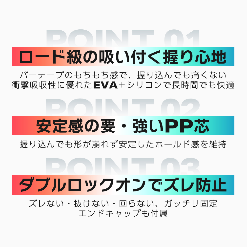 ・グリップの両端を固定するダブルロックオン方式を採用。強い力がかかってもズレることなく、安定したハンドリングをサポートします。