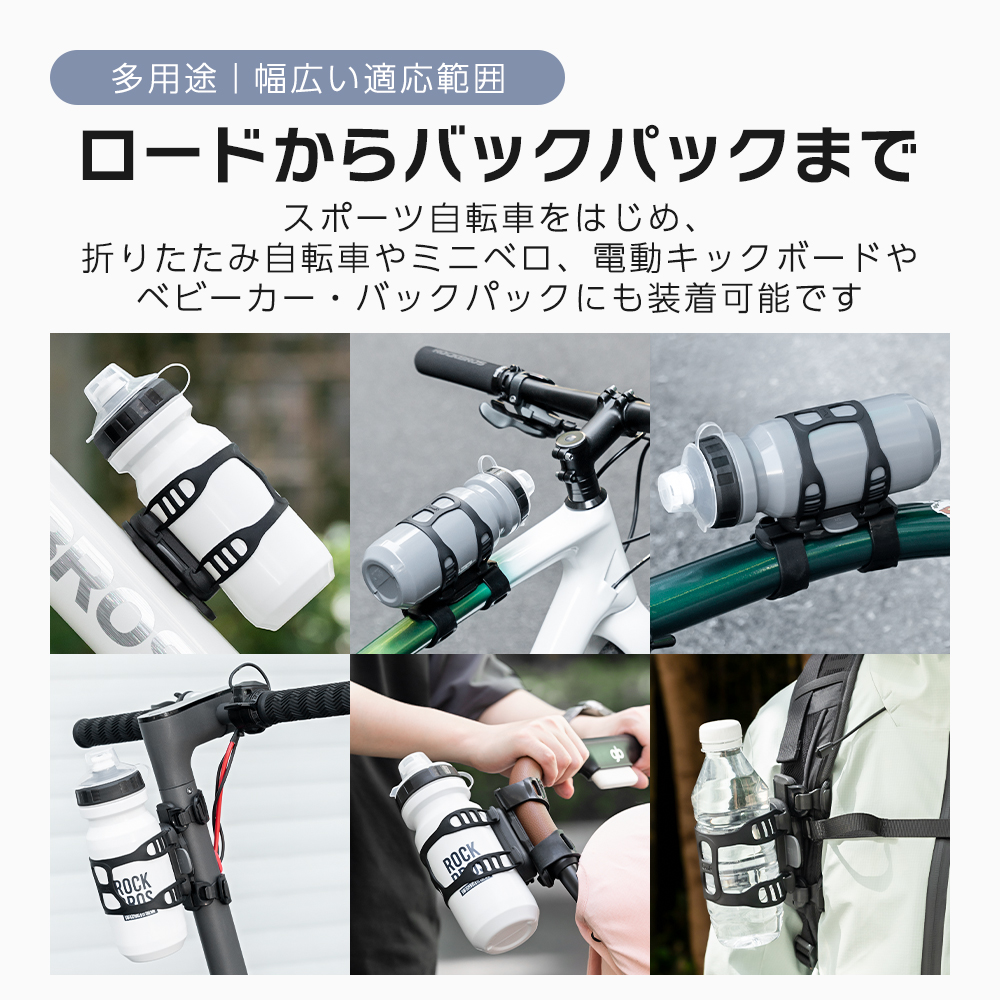 ・ロードバイクやクロスバイクはもちろん、電動キックボードやベビーカーなど、ダボ穴がない乗り物にも取り付け可能です。