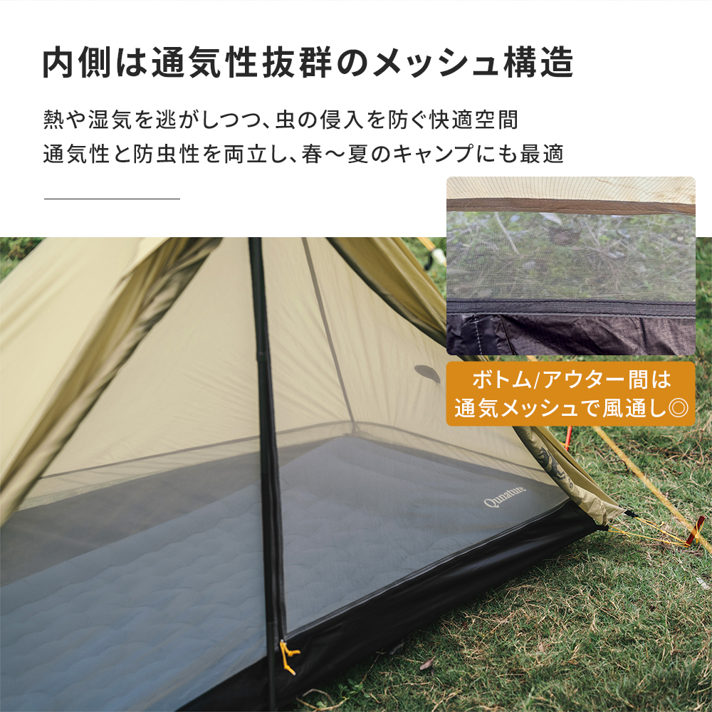 ・シーズン問わず快適に使用できますが、特に内部のメッシュが蒸れや熱を排出し、夏場のキャンプで活躍します。
