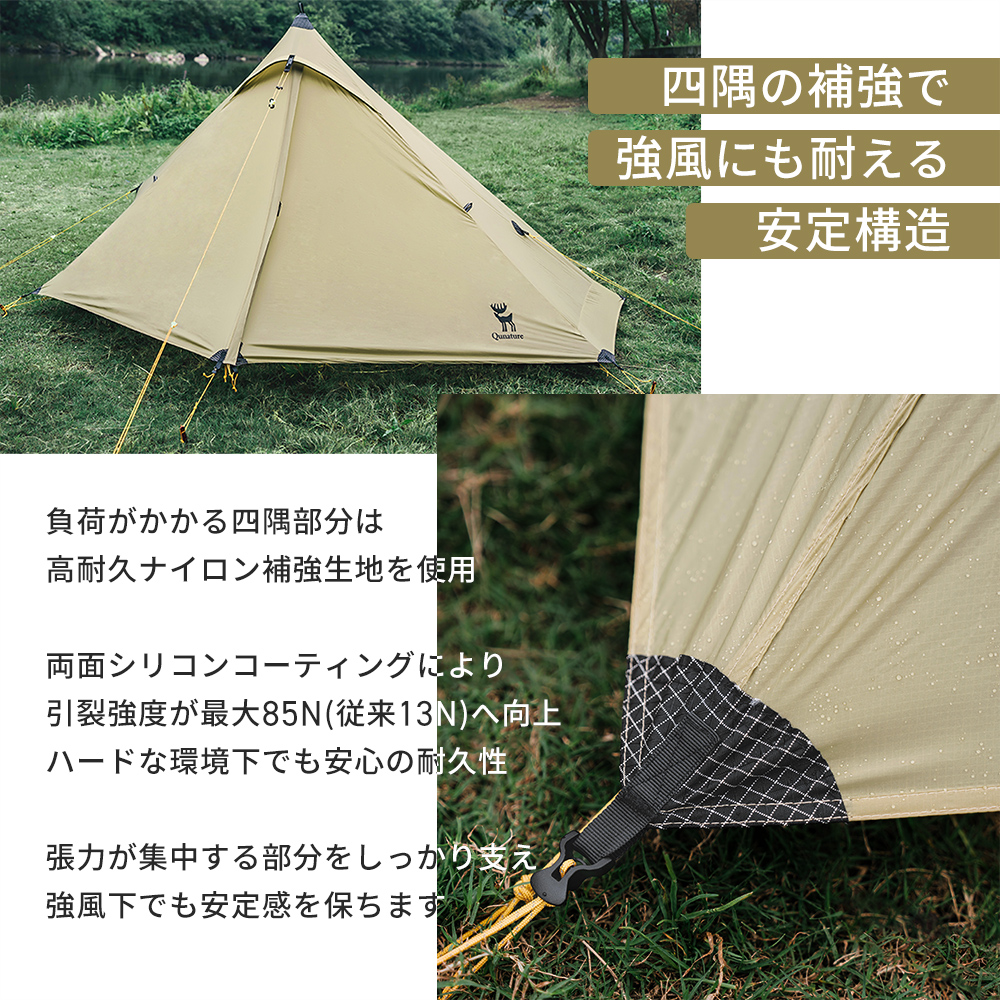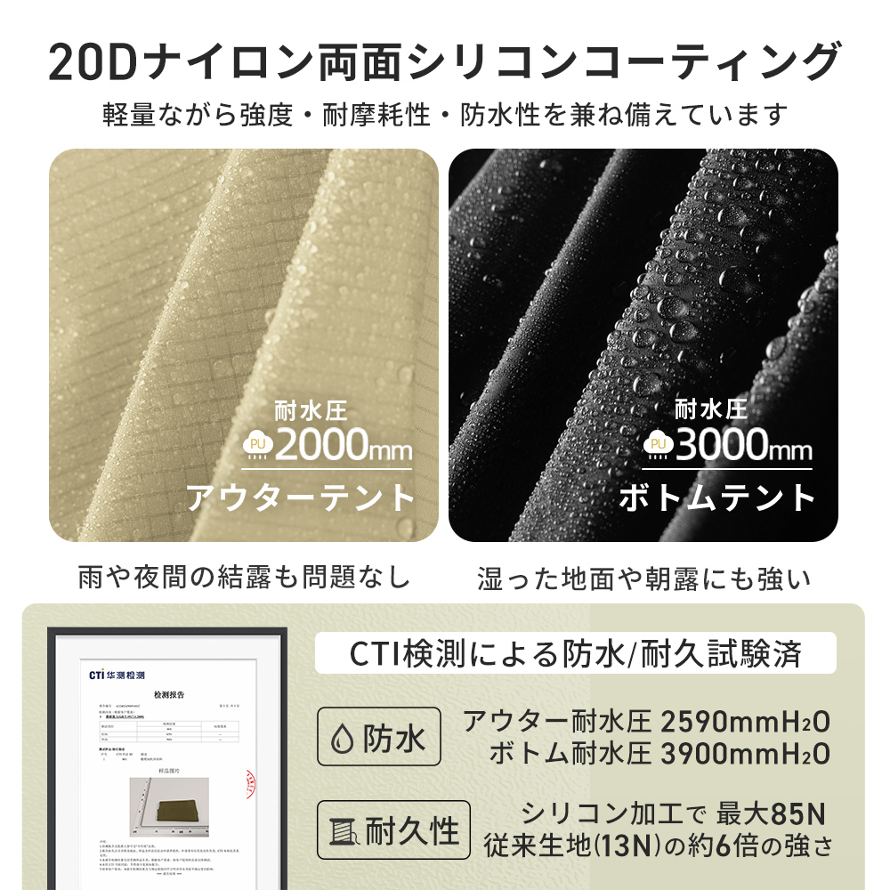| 素材 | アウターテント:20Dナイロン 両面シリコンコーティング ボトムテント:20Dナイロン シリコンコーティング |
