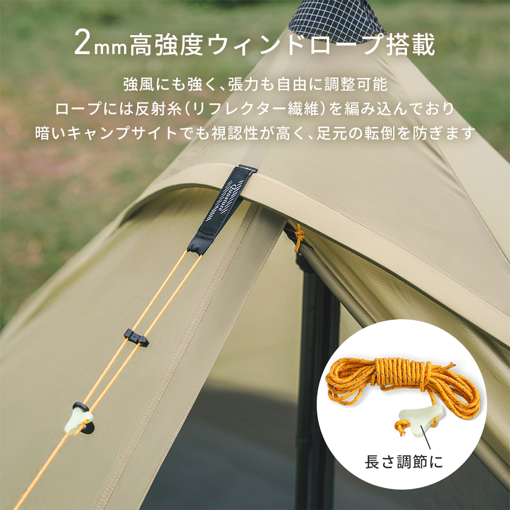 ・夜間の視認性を高める反射糸入りの高強度ロープで、強風時でも安定感をキープします。