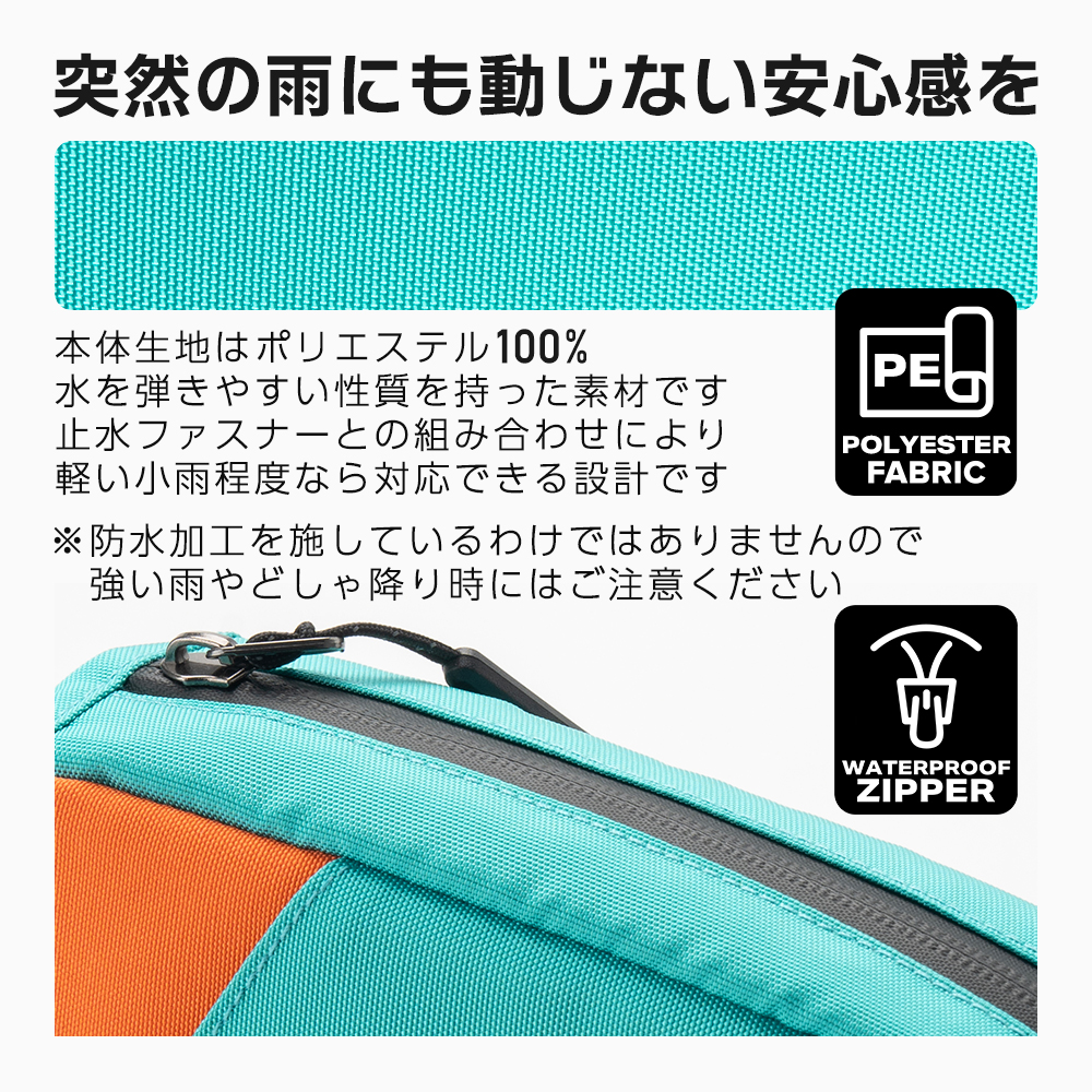 急な小雨でも安心!撥水素材と軽量設計で、通勤や街乗りの小物収納に大活躍