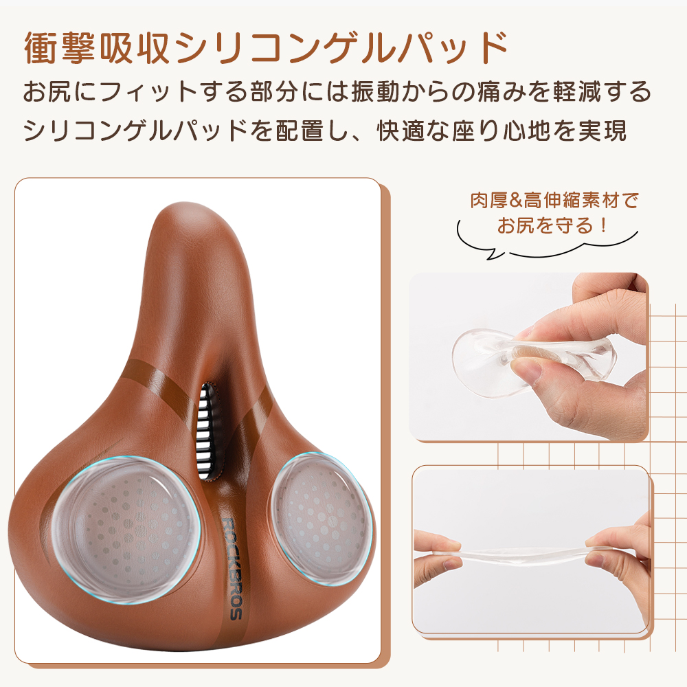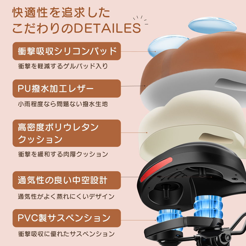 ダブルソフト構造で抜群の座り心地を実現したサドル。厚みのある高密度ポリウレタンフォームと液体シリコーンを採用し、長時間のライディングでも快適なクッション性を提供します。