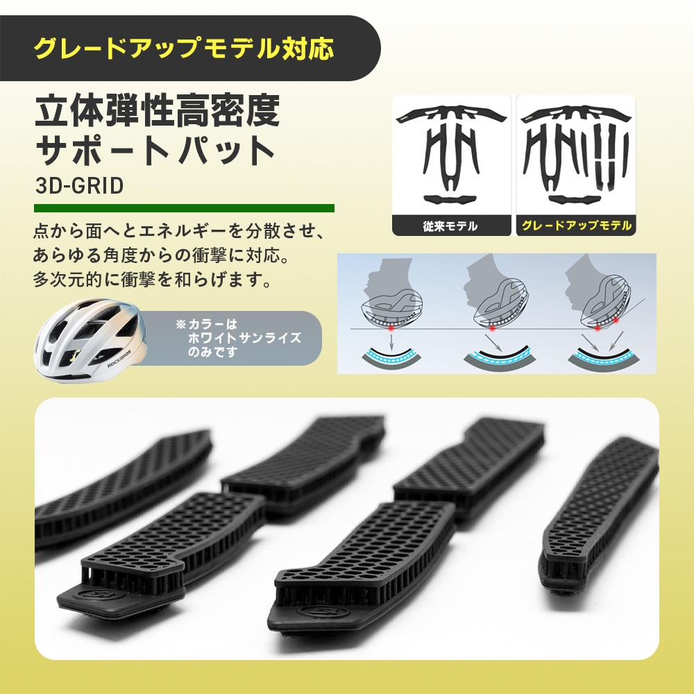 ・アップグレードモデルには、あらゆる角度からの衝撃に対応した3D-GRIDパッドが付属しており、より高い安全性を求める方におすすめです。