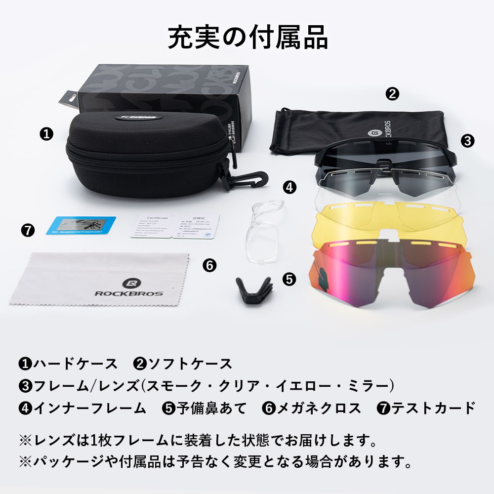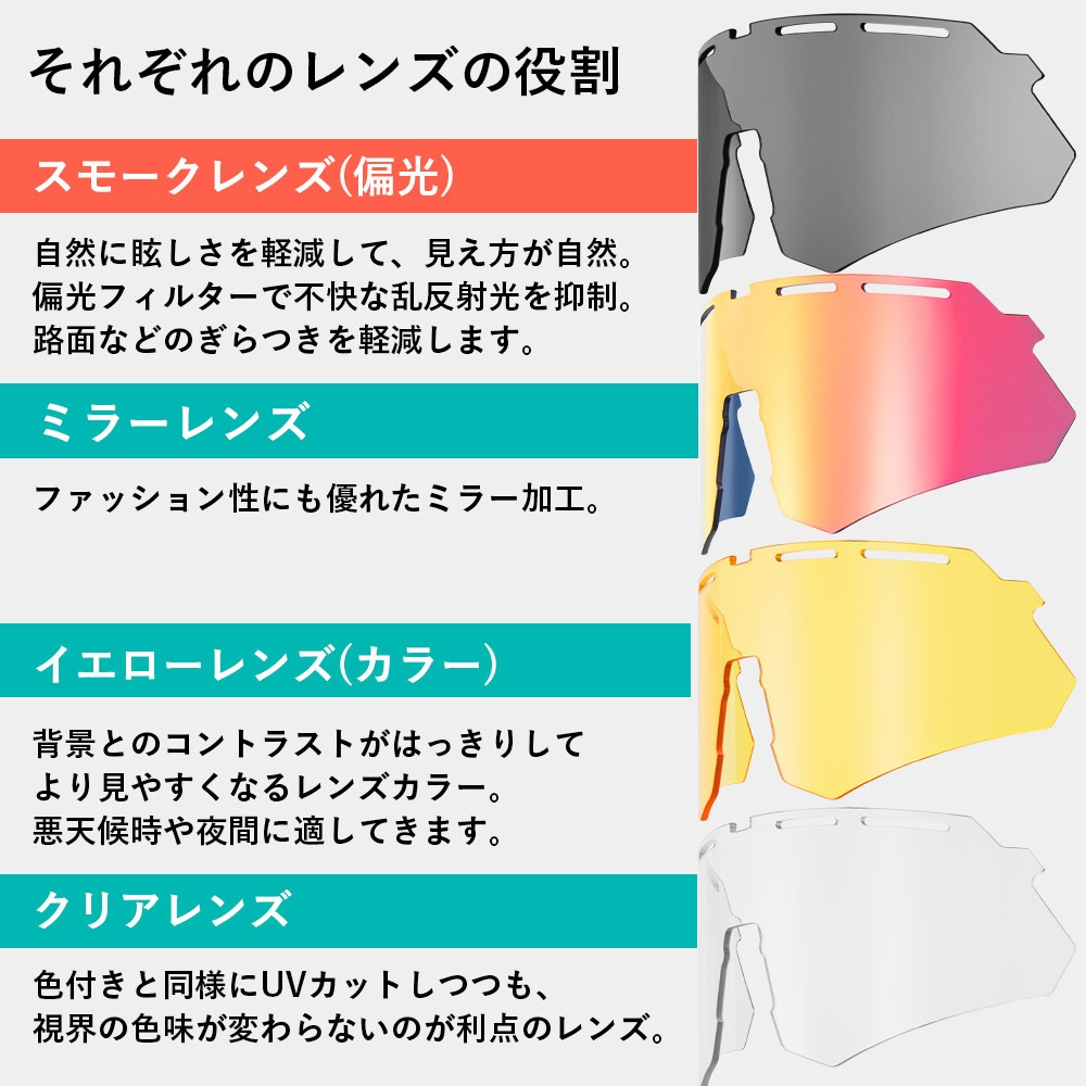 | 素材 | ■レンズの素材について ミラーレンズ/イエローレンズ/クリアレンズ:PC スモークレンズ:TAC ■フレーム素材:TR90 |