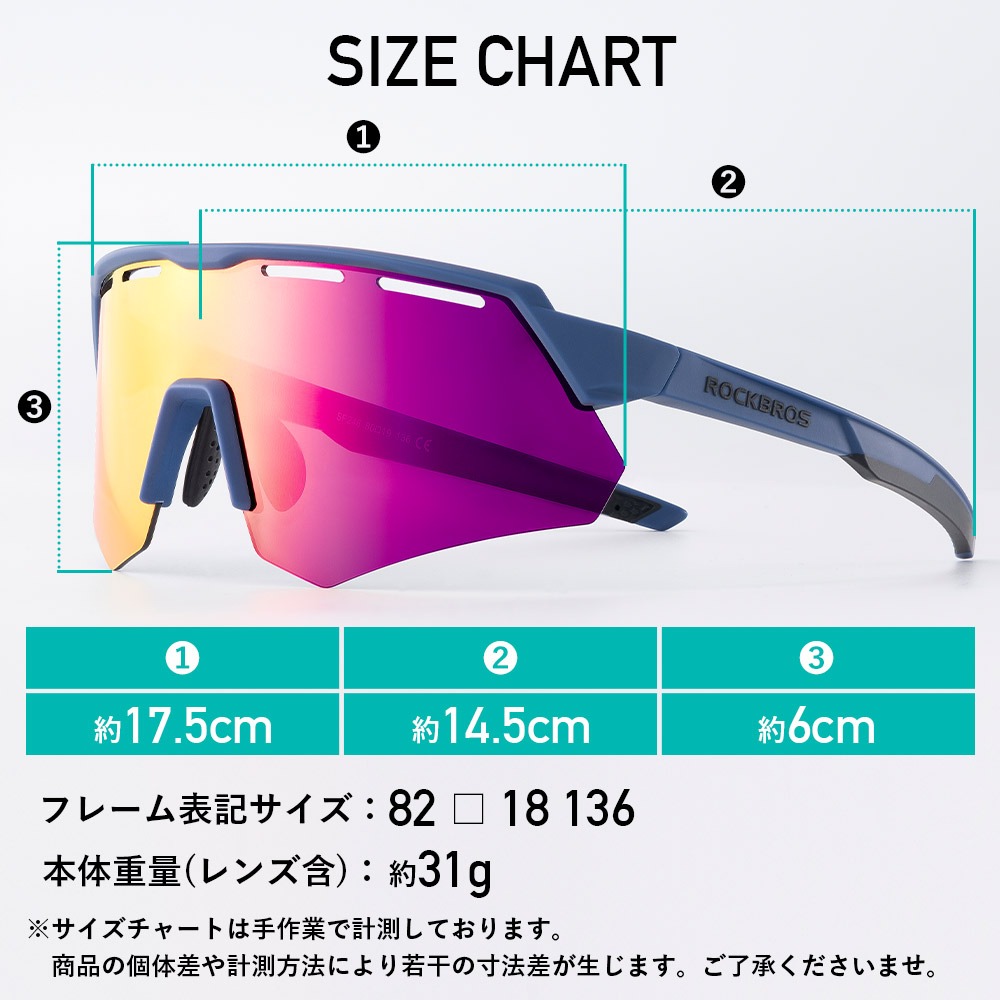 | サイズ | サイズ:レンズの大きさ:約17.5cm 鼻からテンプルまでの長さ:約14.5cm 本体重量:約31g |